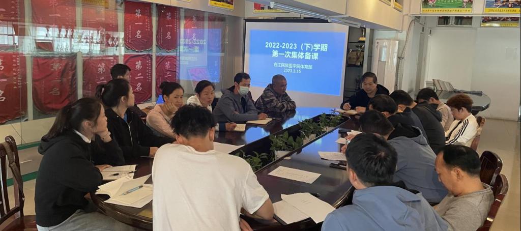 根据学校2023年春季学期开展教研室集体备课和教师试讲活动的通知要求,且为进一步规范教学管理,促进教风建设,不断提升教师教育教学能力,beats365官网 网页版公共体育教研室于2023年3月15 日下午3时组织全体教师在体育训练中心二楼会议室开展集体备课活动,本次活动由莫国锃老师主持。